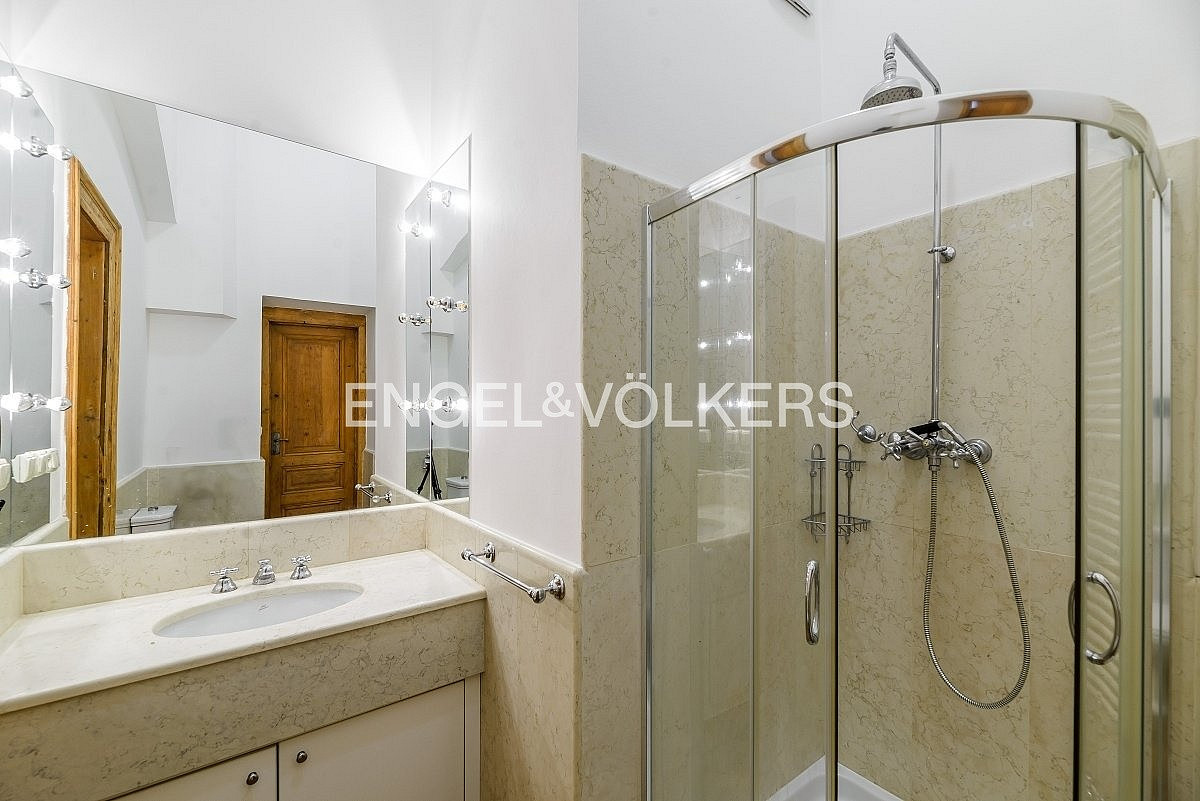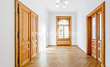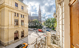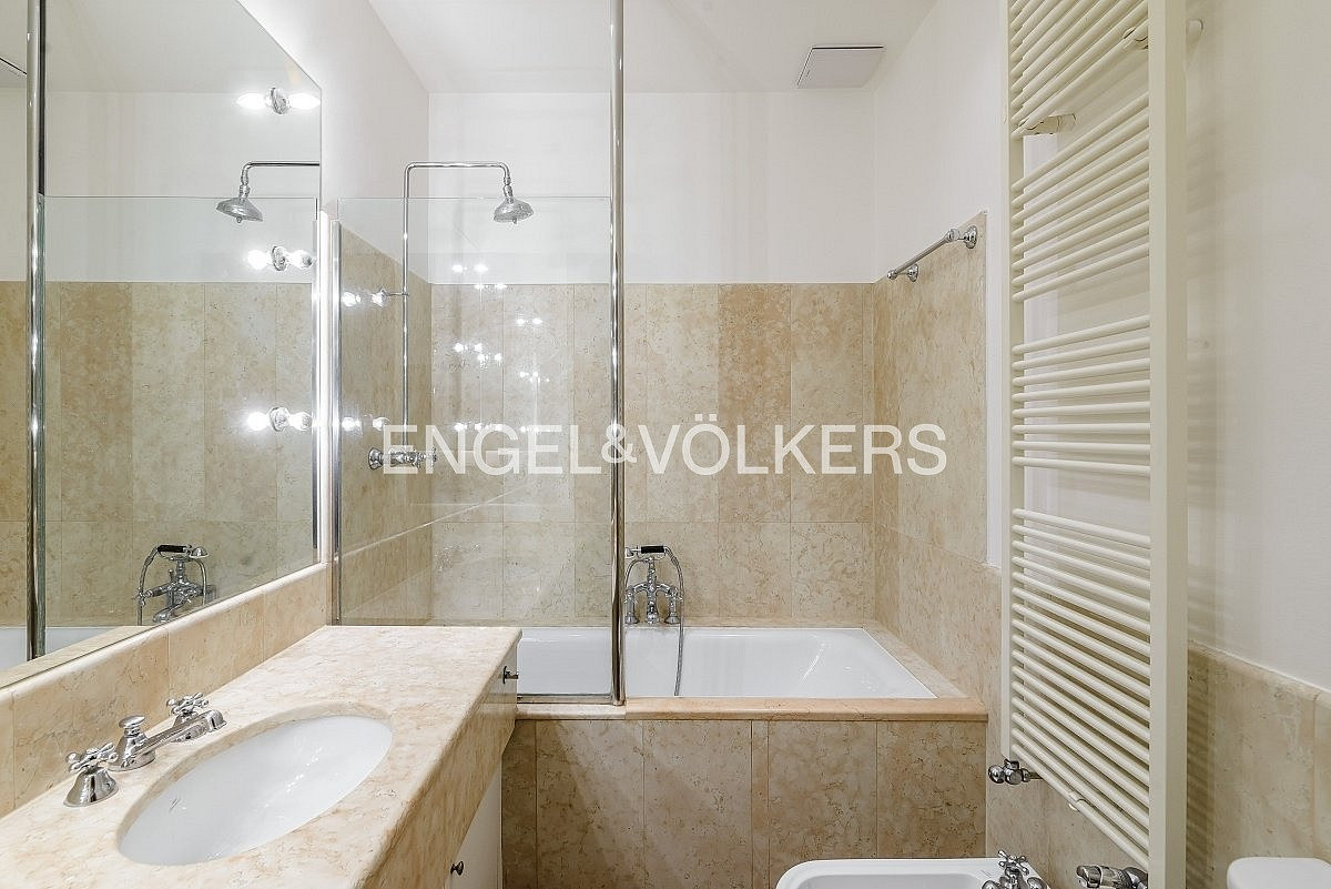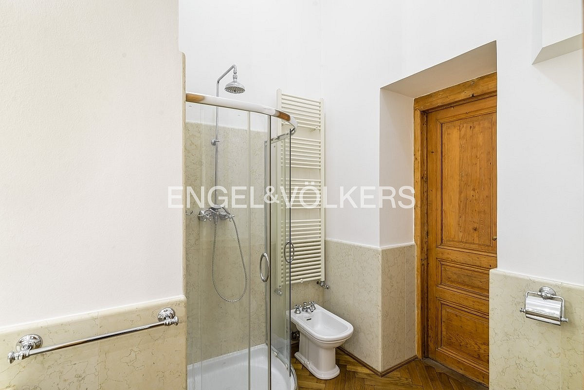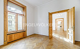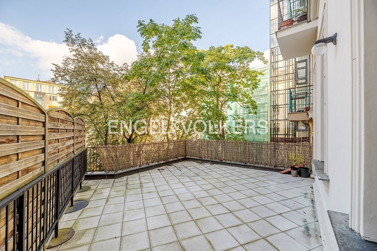 V bytě je světlý obývací pokoj, kuchyně, která je kompletně vybavena všemi spotřebiči značky Miele a čtyři další pokoje, které jsou prostorné a vzdušné s vysokými stropy zdobenými štuky.