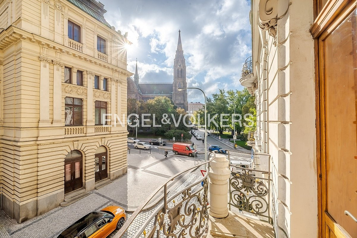 Krásný historický činžovní dům na Vinohradech je vzdálen asi jednu minutu chůze od náměstí Míru.