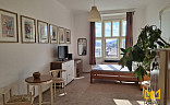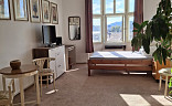 Pokoj je neprůchozí a uzamykatelný, vybaven: postel, šatní skříně- hodně úložného prostoru, komoda, stůl, židle. Po domluvě možnost TV a internet. Podlaha parkety a položen koberec, okna jsou nová orientovaná do klidné slepé ulice s výhledem na Petřín.