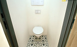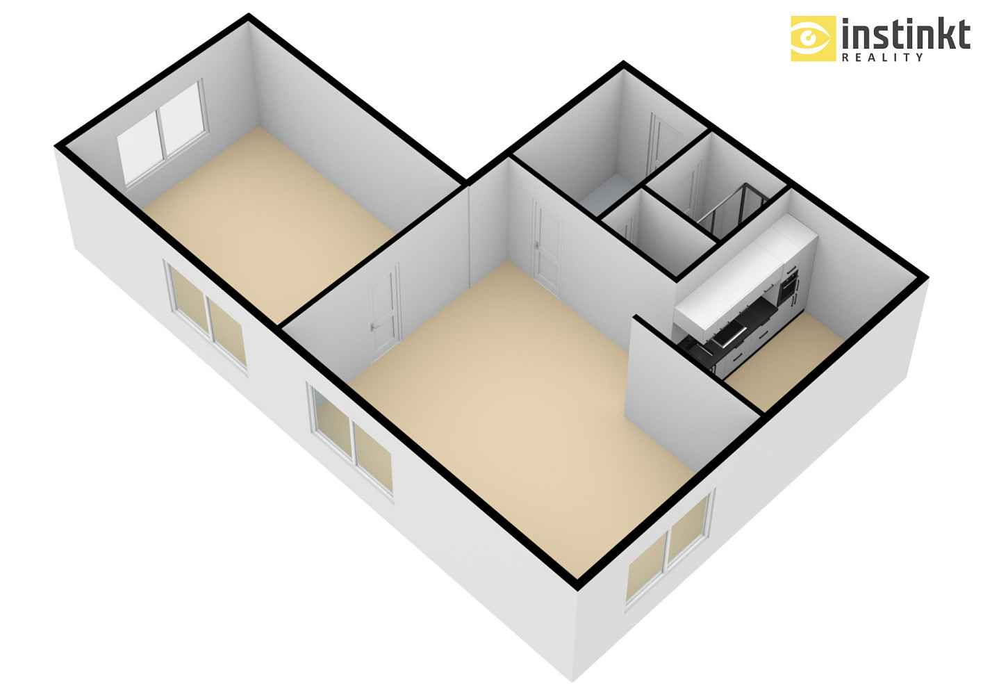Byt se skládá z ložnice, z obývacího pokoje, kuchyňského koutu, který je vybaven kuchyňskou linkou se spotřebiči (sklokeramická varná deska, el. trouba, digestoř) – přípojka na pračku je v kuch. lince. Dále se byt skládá ze vstupní chodby, samostatné toalety, koupelny s velkým sprchovým koutem a topným žebříkem. Součástí nájmu je i sklepní kóje (2m²) v suterénu domu, kde je k dispozici také společná kočárkárna/kolárna.