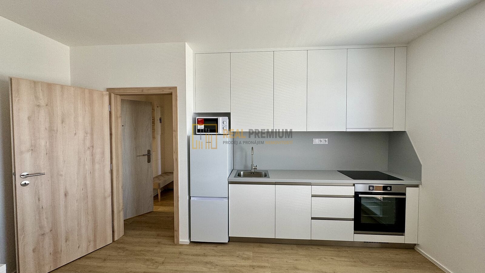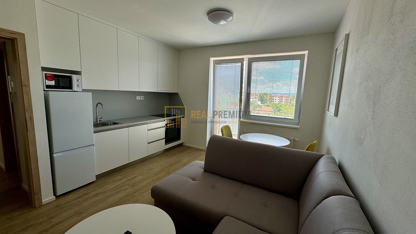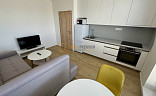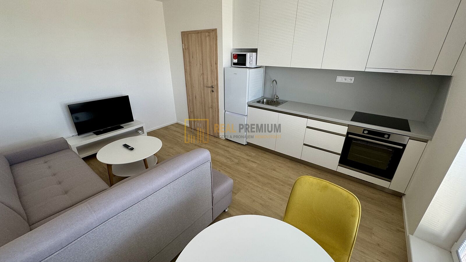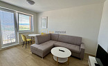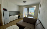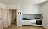 - obývací pokoj vybavený sedací soupravou, stolek + židle, TV, kuchyňská linka včetně lednice s mrazákem, mikrovlnné trouby, el. trouby a varnou deskou