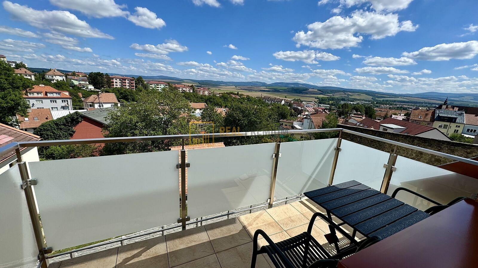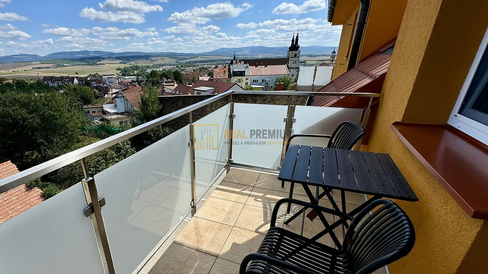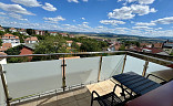 Z obývacího pokoje je vstup na balkon s výhledem do krajiny. Balkon je vybaven venkovním nábytkem.
