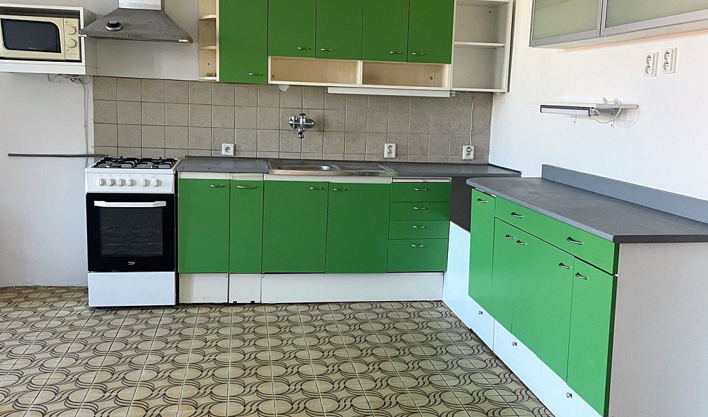 • prostorný obývací pokoj propojený s kuchyní (k dispozici kuchyňská linka s kombinovaným sporákem s plynovými hořáky a elektrickou troubou, mikrovlná trouba)