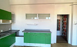 V bytě zůstává částečné vybavení (židle, stoly, skříňky, poličky).