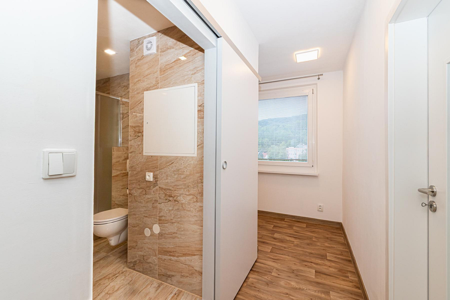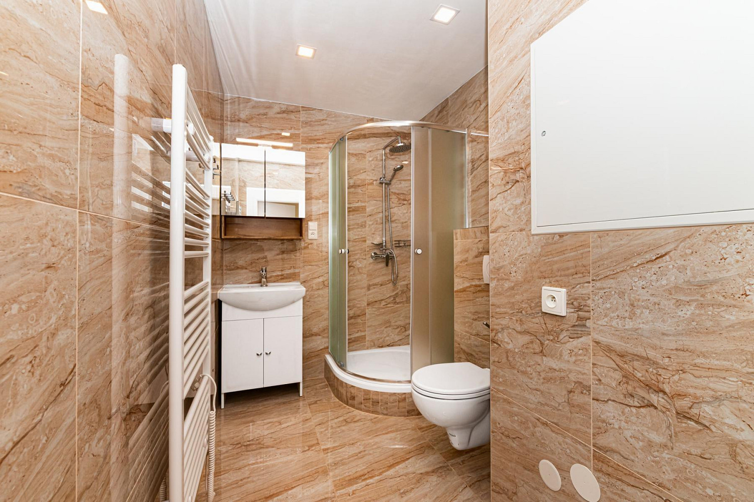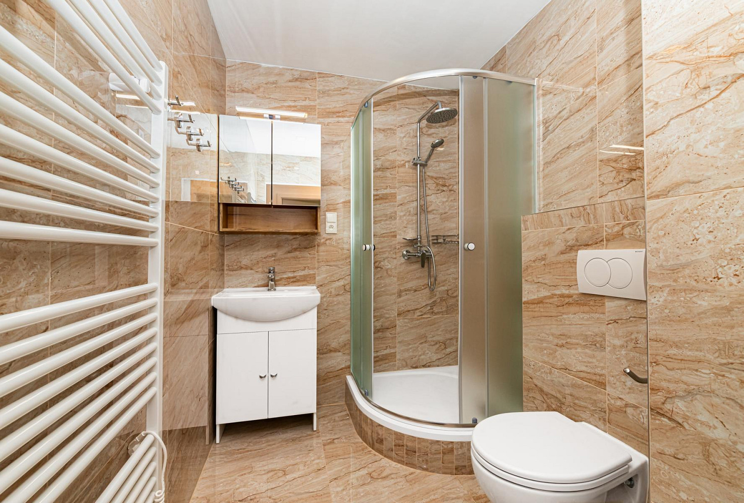 kompletně vyzděná a nadstandardně prostorná koupelna s novými zařizovacími předměty a sprchovým koutem