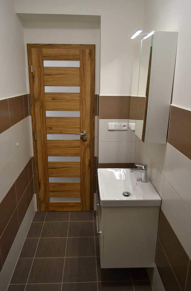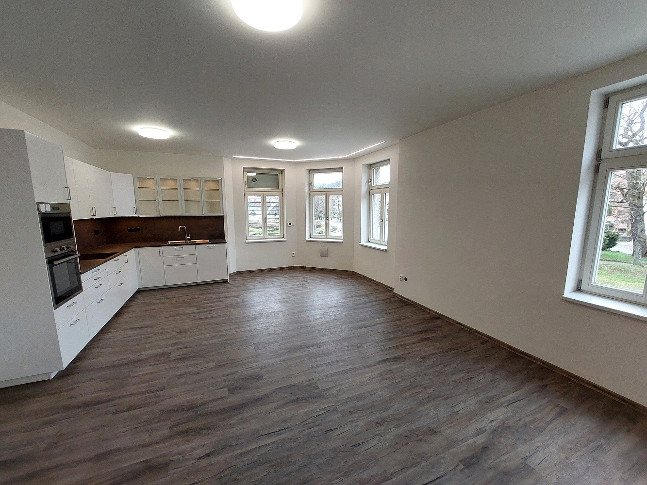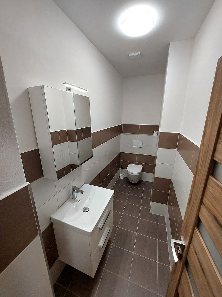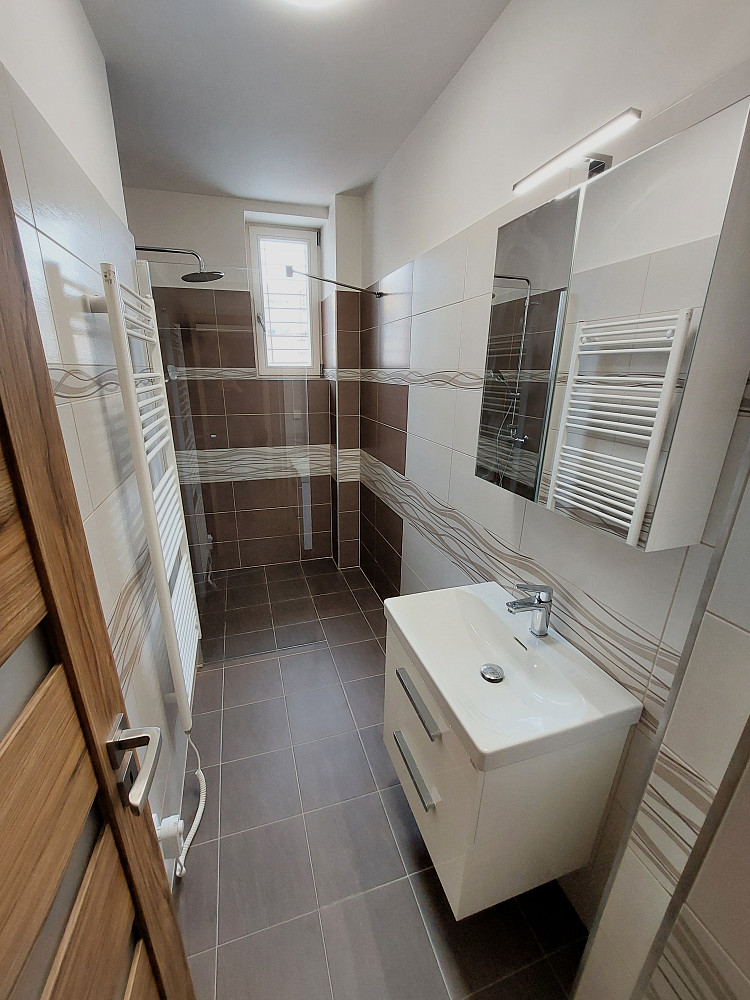 Moderní byt typu 3+kk (93 m²) po kompletní rekonstrukci ve 2. podlaží cihlové budovy, k pronájmu přímo od majitelů. Základem bytu je velký obývací pokoj (36 m²) s kuchyňským koutem vybaveným elektrickou troubou, vestavnou mikrovlnnou troubou, indukčním sporákem, myčkou na nádobí a digestoří. Dále je k dispozici ložnice (18,5 m²), pokoj (13 m²), koupelna se sprchou, umývárna s toaletou, sušárna/komora (4 m²) a chodba.