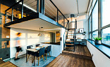 Přízemí loftového bytu je vybaveno kuchyňským koutem se spotřebiči, prostorem pro jídelnu, obývacím pokojem, koupelnou, záchodem a vestavěnými skříněmi. Ve vestavěném patře se nachází ložnice, pracovní stůl a další vestavěná skříň.