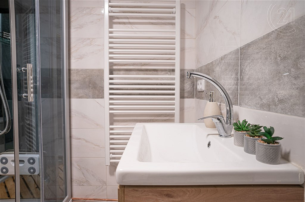 Byt je nabízen do pronájmu částečně vybavený, a to kuchyňskou linkou, v koupelně se nachází sprchový kout a WC.
