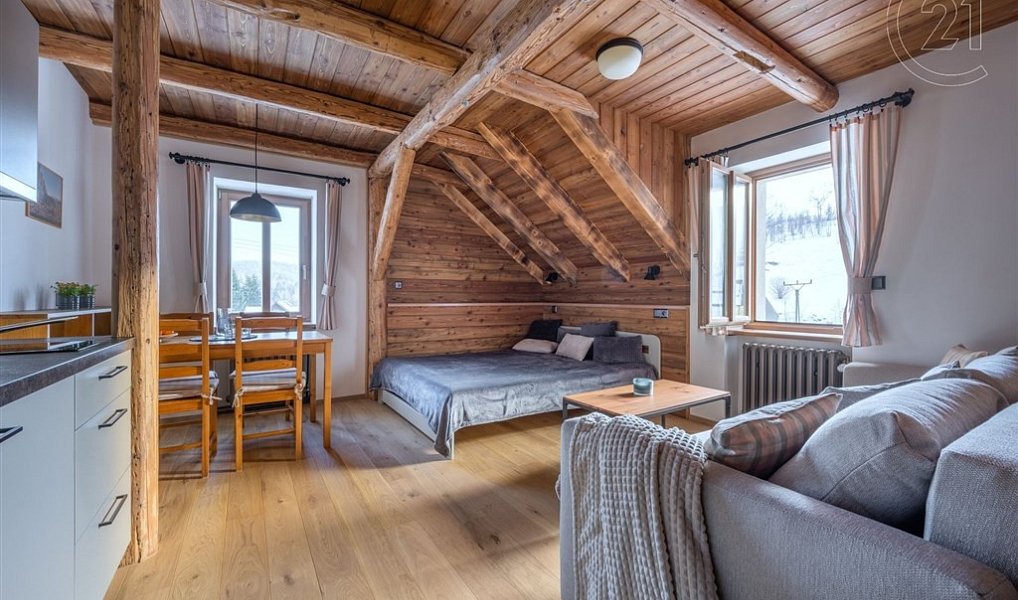 Nabízíme k dlouhodobému pronájmu apartmán o velikosti 25,5 m² a dispozici 1+kk. Apartmán v nově zrekonstruovaném objektu je plně vybaven vším, co potřebujete k příjemnému trávení volných dní na horách. Nájemce apartmánu může využívat mnoha služeb a prostor společných částí horské chaty, jako například prostornou jídelnu s krbem, knihovnu, sušárnu na lyžařské boty, lyžárnu, kolárnu a také zastřešené venkovní posezení s krbem, dětské hřiště apod.