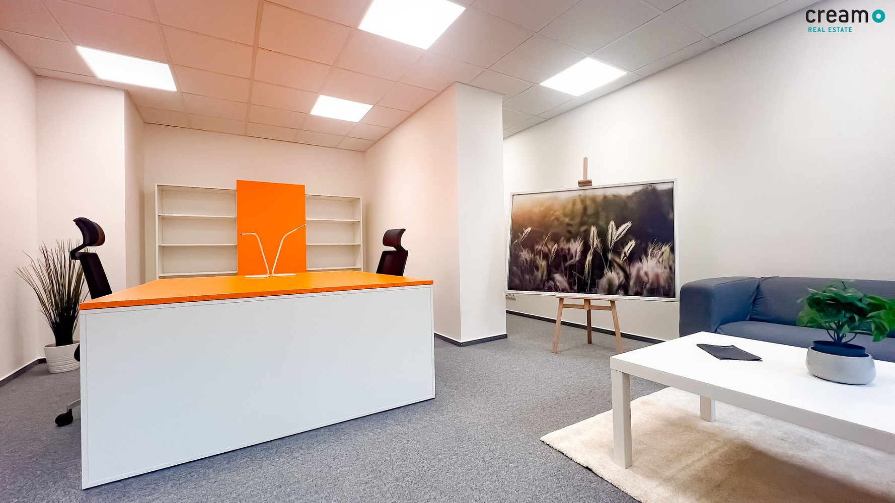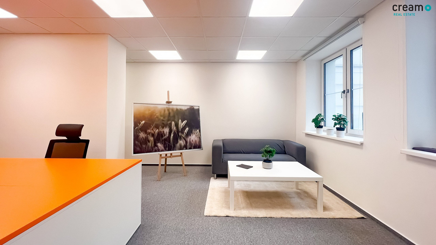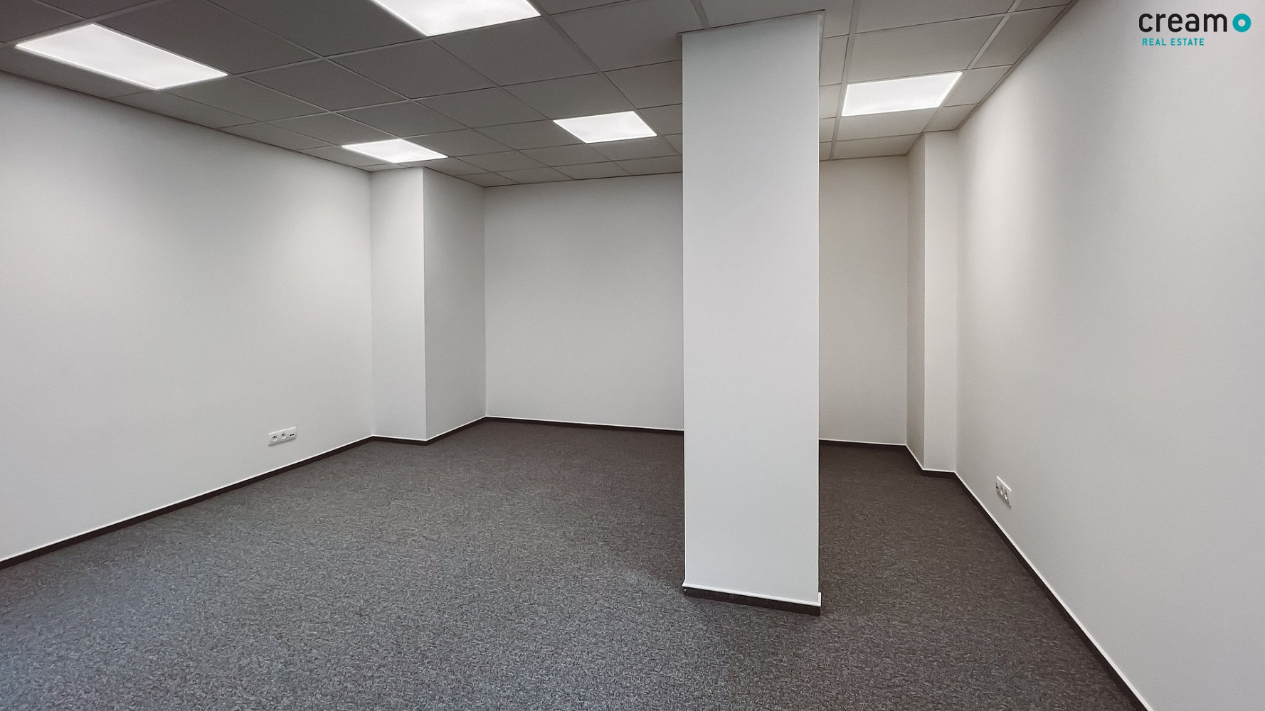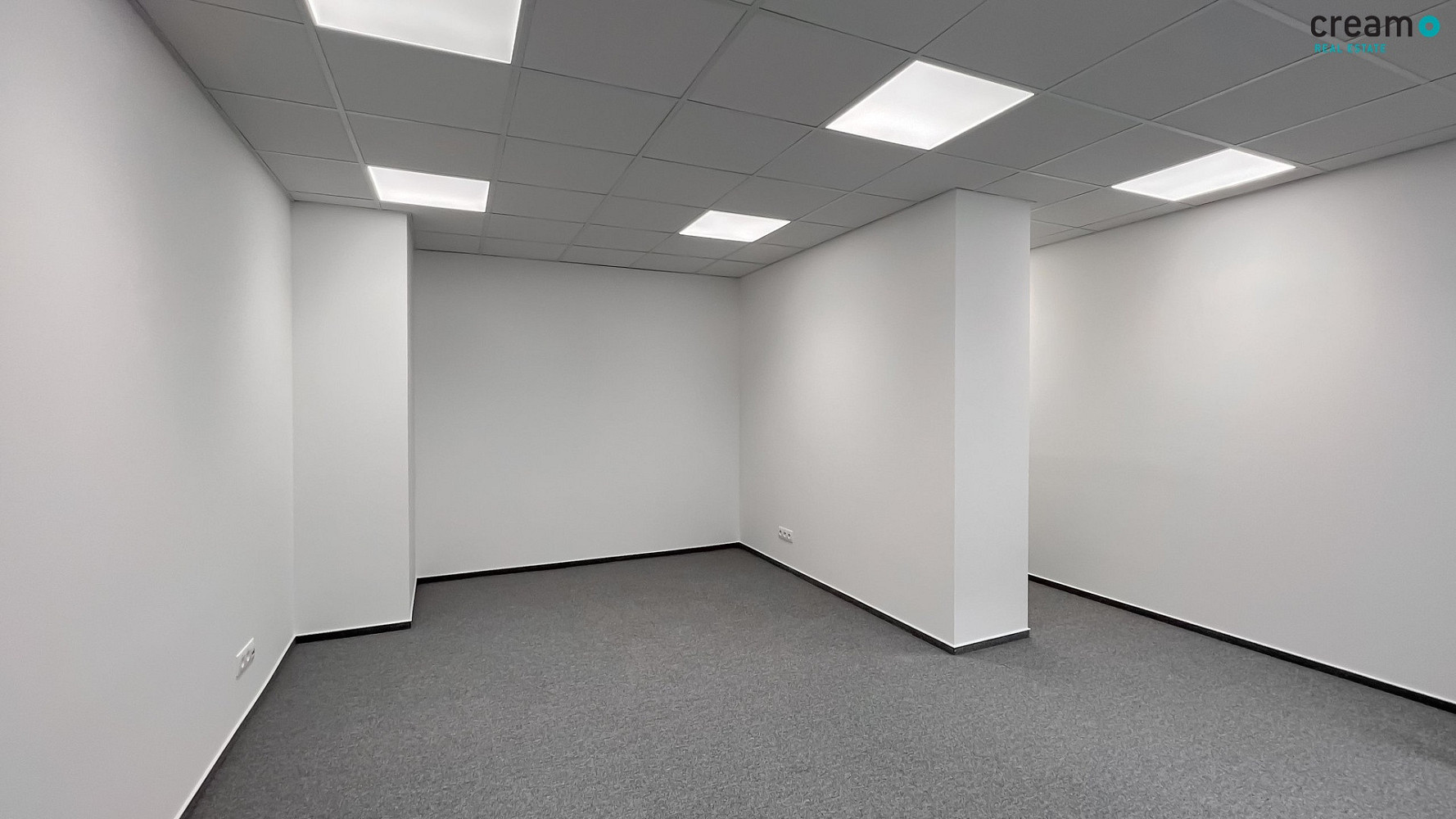 Kancelář má bílou výmalbu, plastová okna s izolačním trojsklem i zastínění látkovou roletou. V prostoru je nový podhled a na podlaze uložen zátěžový koberec s lištou. Vstupní dveře do kanceláře jsou opatřeny nadsvětlíkem. Samozřejmostí je klimatizace.