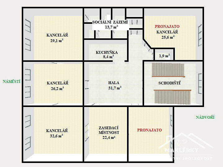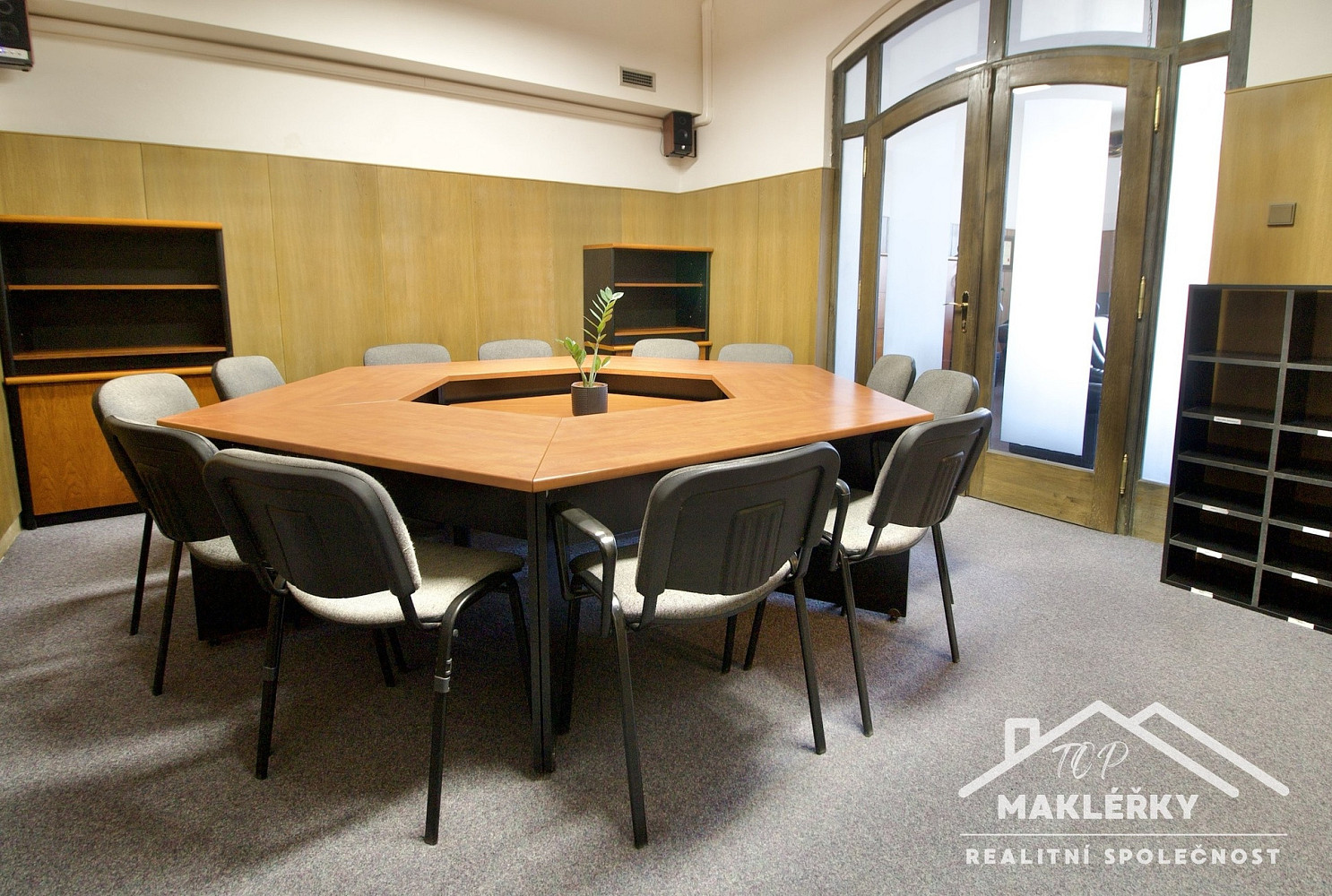 Nabízíme vám k pronájmu soubor kanceláří na prestižní adrese v samém srdci Kolína, na Karlově náměstí. K pronájmu se nabízí tři samostatné kanceláře, zasedací místnost a příslušenství, které tvoří sociální zařízení a kuchyňka. K dispozici je rovněž prostorná vstupní hala, která může sloužit i jako čekárna. Výměry jednotlivých ploch vidíte na přiloženém plánku, celková užitná plocha činí 132 m² bez haly. Kanceláře se nabízejí v 1. patře památkově chráněného domu, z jejich oken máte krásné kolínské náměstí jako na dlani. Uvedené prostory se nabízí vybavené nábytkem, osvětlením a dalším vybavením tak, jak vidíte na fotografiích. Podlahovou krytinu tvoří koberce, v hale a příslušenství je dlažba. V případě potřeby větší užitné plochy je možné rozšířit pronajímaný soubor kanceláří ještě o jednu, s výměrou 25,6 m². Kauce ve výši dvou měsíčních nájmů a provize realitní kanceláři ve výši jednoho měsíčního nájmu. Pokud máte zájem o zviditelnění své firmy v samém centru dění v Kolíně, neváhejte volat makléřku, uvedenou v kontaktech u inzerátu.