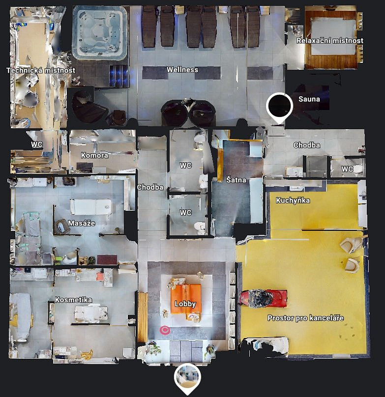 Nachází se zde wellness centrum s vířivkou, odpočinkovou částí, relaxační místností, saunou a vlastní šatnou se sociálním zařízením. Dále masážní salón se dvěma oddělenými křesly. Kosmetické studio taktéž s dvěma křesly (nyní jedno obsazeno) a prostor, který může sloužit jako kancelář, obchod, výdejna zboží nebo kadeřnický salón.