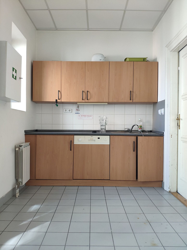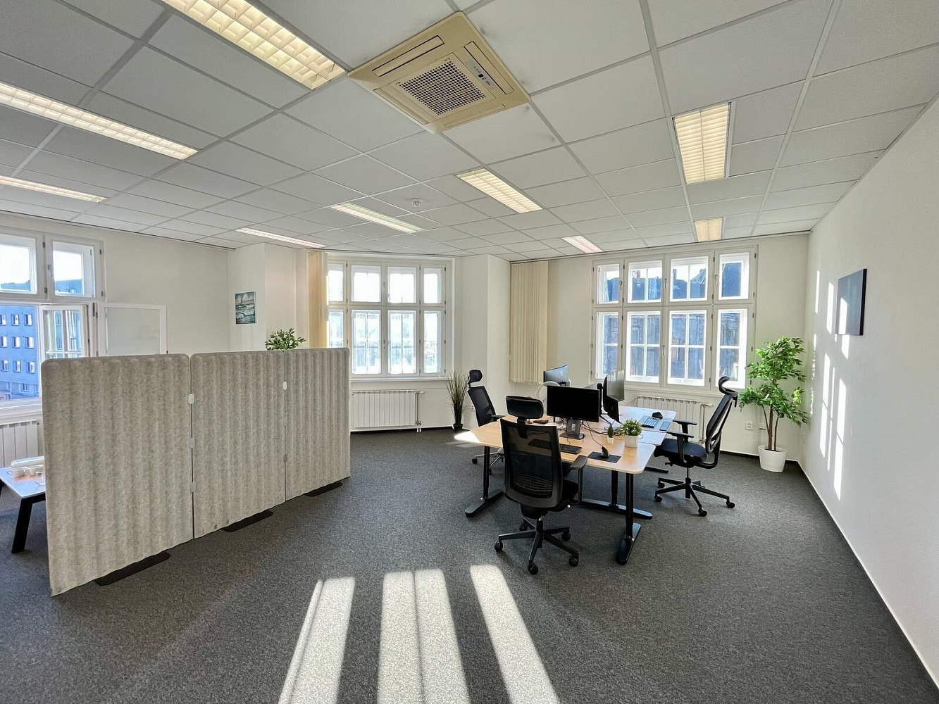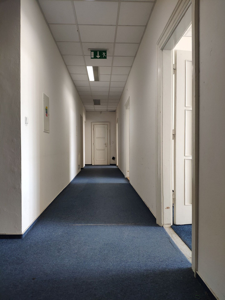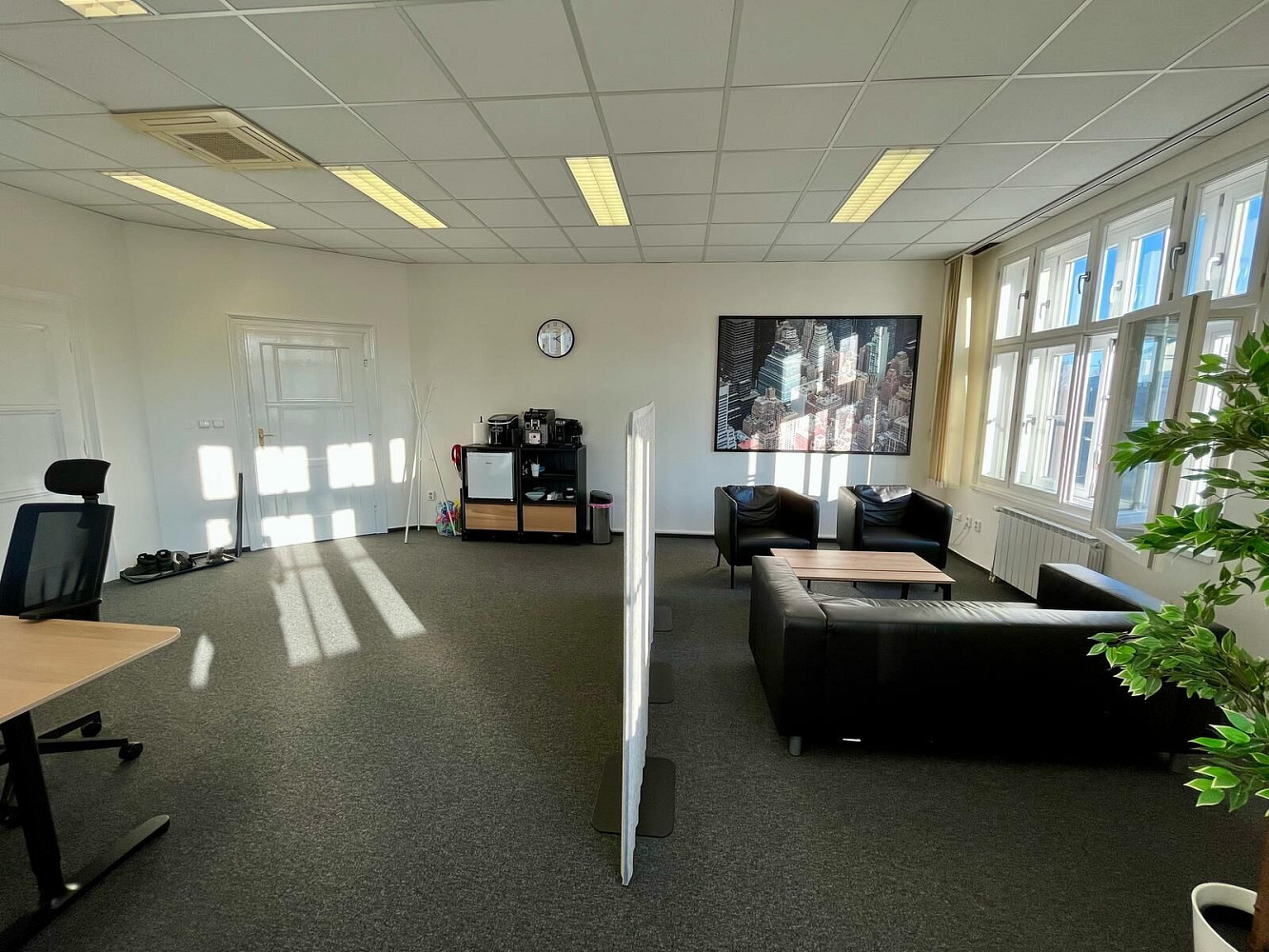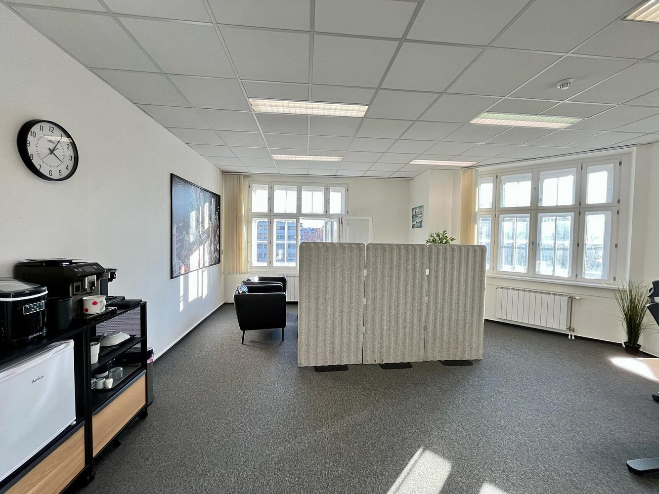 Nabízíme k pronájmu slunnou, prostornou, klimatizovanou kancelář o výměře 68 m² ve čtvrtém nadzemním podlaží budovy na Smetanově náměstí 1 v Ostravě. V nabízené kanceláří jsou zřízeny průchozí dveře do vedlejší kanceláře, která má výměru dalších 33 m² a v případě zájmu ji lze také pronajmout. Podlaží se skládá ze vstupní haly, 7 samostatných kanceláří, kuchyňky a 2 WC.