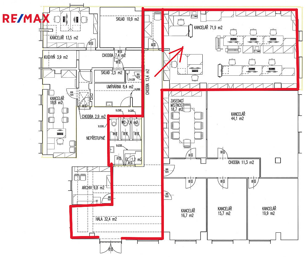 Kancelář není vybavena nábytkem. Společná kuchyňka s WC. K dispozici je možnost pronajmout si více kanceláří najednou, které se nacházejí na stejném patře.