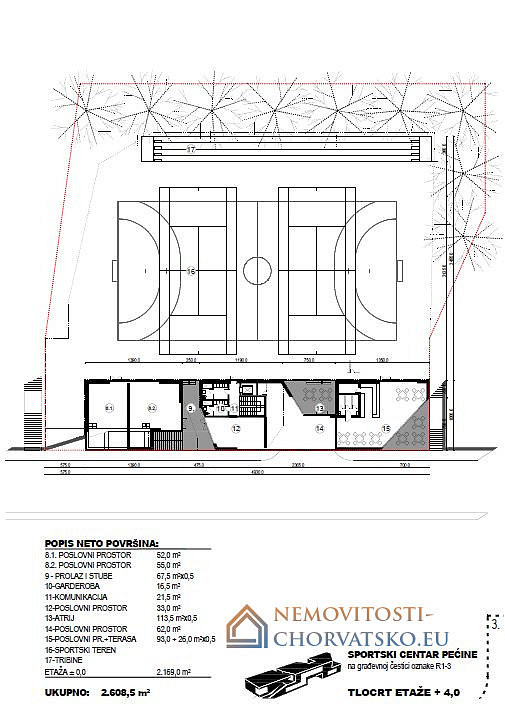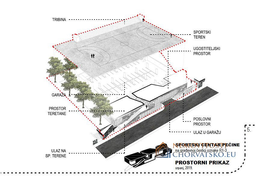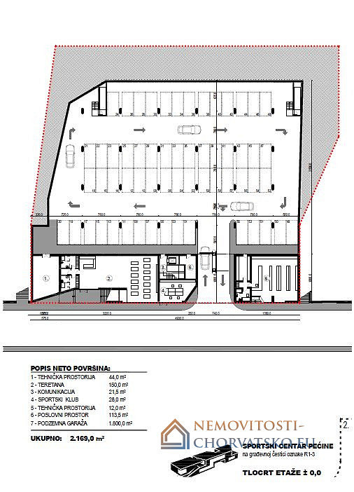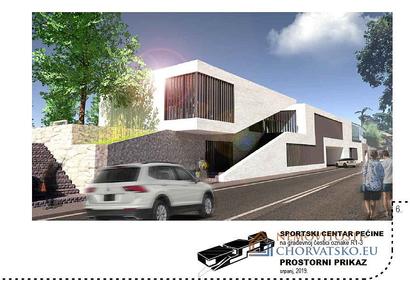 RIJEKA, PEĆINE - pozemek 2. řada k moři 3072 m² pro sportovní centrum s garážemi / hotel k pronájmu Pro lokalitu byl vytvořen koncepční návrh, který navrhuje výstavbu SPORTOVNÍHO CENTRA PEĆINE s podzemní garáží, hlavní budovou a sportovním hřištěm v Rijece, osada Pećine. Předmětná oblast se nachází v působnosti ÚPÚ městské oblasti Pećine a má územní označení R1-3. Dle DPÚ zóna zahrnuje plánovaný účel R1 - Sportovně rekreační účel - SPORT. Stavební pozemek s územním určením má podle ÚPÚ celkovou výměru 3 072,0 m², přičemž největší povolená zastavěná plocha pozemku je 2 445,0 m². Maximální povolený počet podlaží je P+1 s maximálním limitem výšky budovy celkem 8,0 m. SOUČASNÝ STAV: Předmětná zóna v podstatě zahrnuje rovinatou plošinu cca 1,5 m nad ulicí, na které je upraveno sportovní hřiště, konkrétně dva tenisové kurty. Součástí areálu je kromě udržovaného sportoviště také sportovní a stravovací zařízení. Na jihozápadní straně je pozemek vymezen ulicí, která je cca 1,5 m pod úrovní plošiny sportoviště. Severozápadní a část jihovýchodní strany je vymezena veřejnou pěší zónou - veřejnými schodišti. Na severovýchodní straně a částečně na jihovýchodní straně je ohraničeno útesem. PLÁNOVANÝ STAV: Tento koncepční návrh navrhuje výstavbu sportovního centra Pećine a podzemní garáže pro celkem 59 parkovacích míst. Na střeše garáže je plánováno uspořádání sportovní plochy a části tribun. Dle kartografického znázornění 4. STAVEBNÍ PODMÍNKY je plánována výstavba stavebního pozemku s územním označením R1-3, přízemí + 1 budova na regulační čáře o celkové podlahové ploše 490,0 m² a celkové hrubé ploše 780,0 m². Plánovaná část objektu je plánována pro umístění sportovních a rekreačních zařízení, jako je klubový areál, šatny, tělocvična, stravovací a obchodní prostory. Pro rozšíření stavebního pozemku s vjezdem z ulice Šetalište, divize XIII. je plánována podzemní garáž. Na střeše garáže se buduje sportovní hřiště s upravenými tribunami. Seznam čistých oblastí: 1 - Technická místnost 44,0 m² 2 - Polomek tělocvičny 1 150,0 m² 3 - Komunikace 21,5 m² 4 - Sports Club 28,0 m² 5 - Technická místnost 12,0 m² 6 - Kancelář 113,5 m² 7 - podzemní garáže 1 800,0 m² - Pasáž a 67,5 můstku Pokoje 19,0 m² 13- Atrium 113,5 m2x0,5 14- Cateringová oblast 170,0 m² 15- Terasa 26,0 m20,5 16- Sportovní pole 17- celkem 2 608,5 m²- stavební půda pro seriózní investory- v rámci docházky- v rámci docházky) a v rámci přízvuk) a je v rámci přízvuk) a je v rámci přízvuk) a je v přímém přístupu) každodenní život. Nemovitost, ze které dojdete k moři a na pláž za pouhou minutu. PEĆINE: Četné vily se zelenými nádvořími, krásně upravené parky, řada pláží a koupališť a zajímavá historie jsou rysy, které zdobí tuto čtvrť Rijeky nacházející se v daleké jihovýchodní části města. Bývalé místo pro život bohatých zdobí letní domy podél pobřeží obklopené svěžími květinovými zahradami, zatímco v pozdějším období byly postaveny bytové domy. První velké nákupní centrum v Rijece, zábavní park pro děti, házenkářský a tenisový klub, sportovní kluby, poloha, blízkost centra města, hotel a tři ubytovny jsou jen některé z rysů této čtvrti, která nabízí život s relaxací a rekreací.